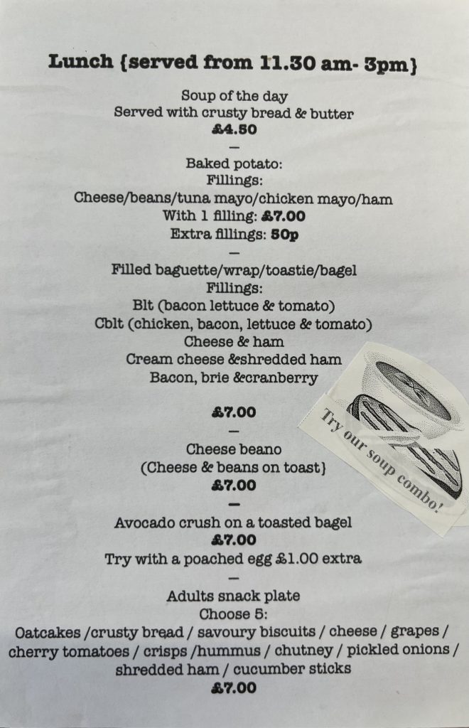 Hello everyone, hope you are well. Thank you for your interest in The Art Room Café. Please find below our menu; we even have special items that you will need to come on down to find out, so please come on down to the café; you won’t be disappointed.